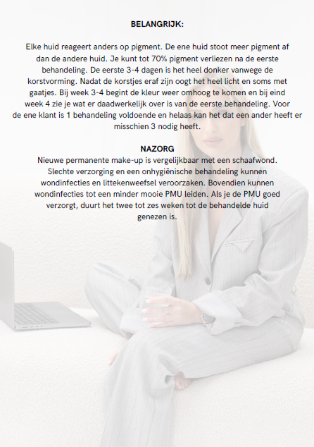 Na de behandeling kan de huid een beetje rood zijn, maar dit trekt vaak binnen enkele uren weg. Het resultaat is na een paar dagen volledig zichtbaar, hoewel het na de eerste sessie vaak nog een touch-up nodig heeft om het gewenste effect te bereiken.